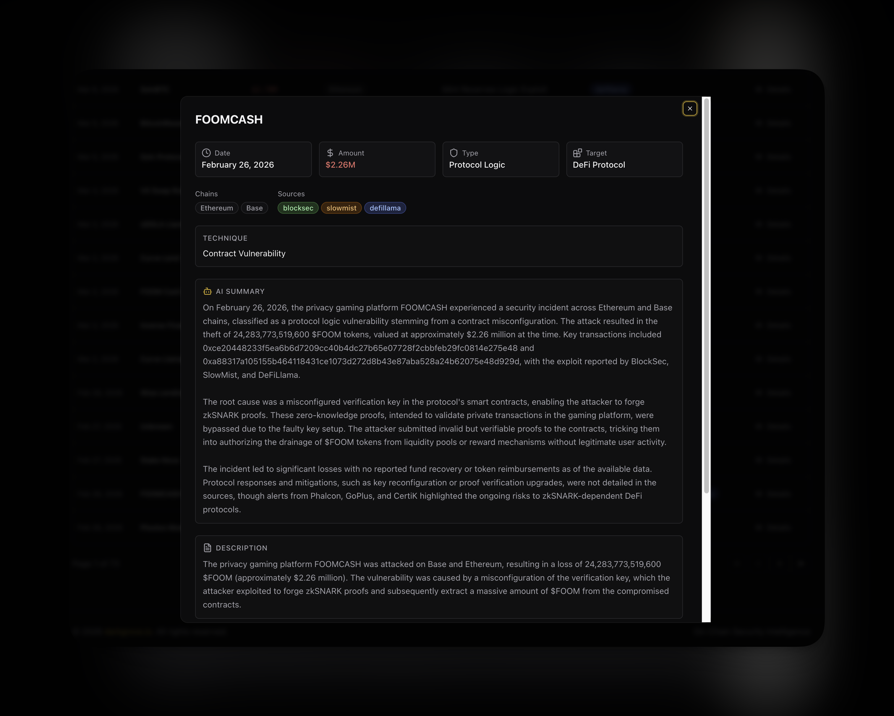 The incident database supports full-text search across protocols, chains, techniques, and sources. Find what you need in seconds, not hours of digging through Twitter threads and scattered dashboards.